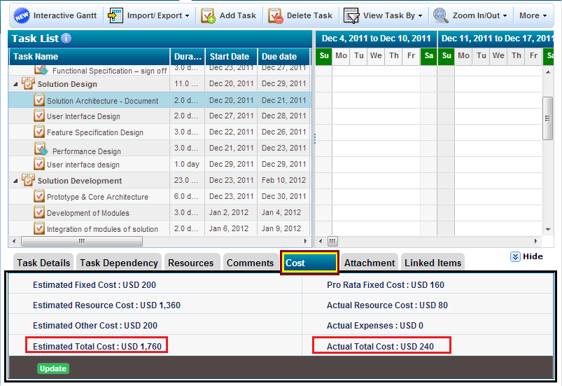 You can track cost details at task level and check estimated and actual costs under different headings like fixed, resource, other/expense costs.
